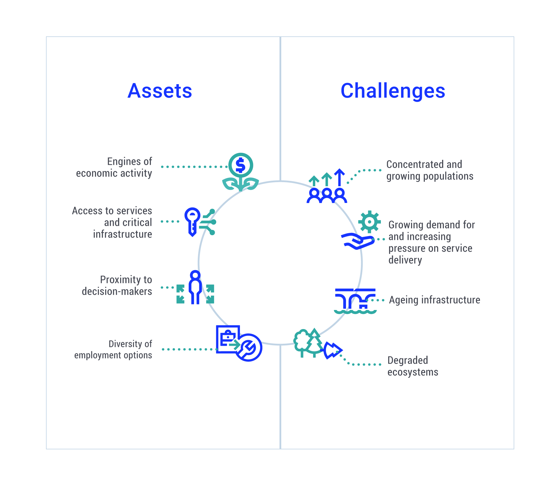 Circular diagram illustrating the assets and challenges that influence adaptive capacity in cities and towns. Assets are identified as engines of economic activity, access to services and critical infrastructure, proximity to decision makers and diversity of employment options. Challenges are identified as concentrated and growing populations, growing demand for and increasing pressure on service delivery, ageing infrastructure, and degraded ecosystems.