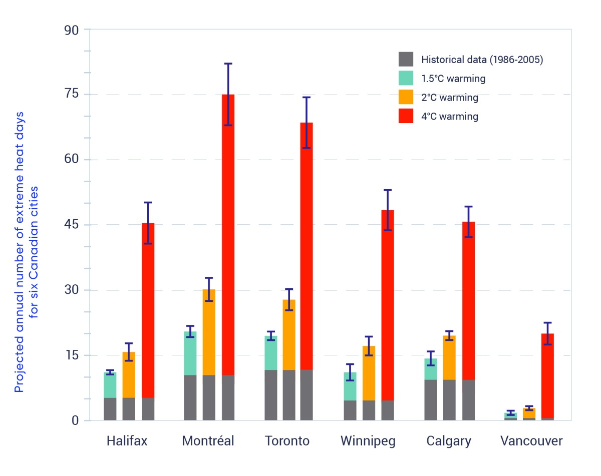 The annual number of extreme heat days projected for six Canadian cities under three warming scenarios: global mean surface temperature of 1.5°C, 2°C, and 4°C above pre-industrial levels. The values are based on statistically downscaled simulations by 24 climate models participating in CMIP5, with the error bars representing the 25th and 75th percentiles, and the grey section showing the number of historical extreme heat days (1986–2005). The threshold for extreme heat differs by city (e.g., Toronto = 31°C, Vancouver = 29°C).
