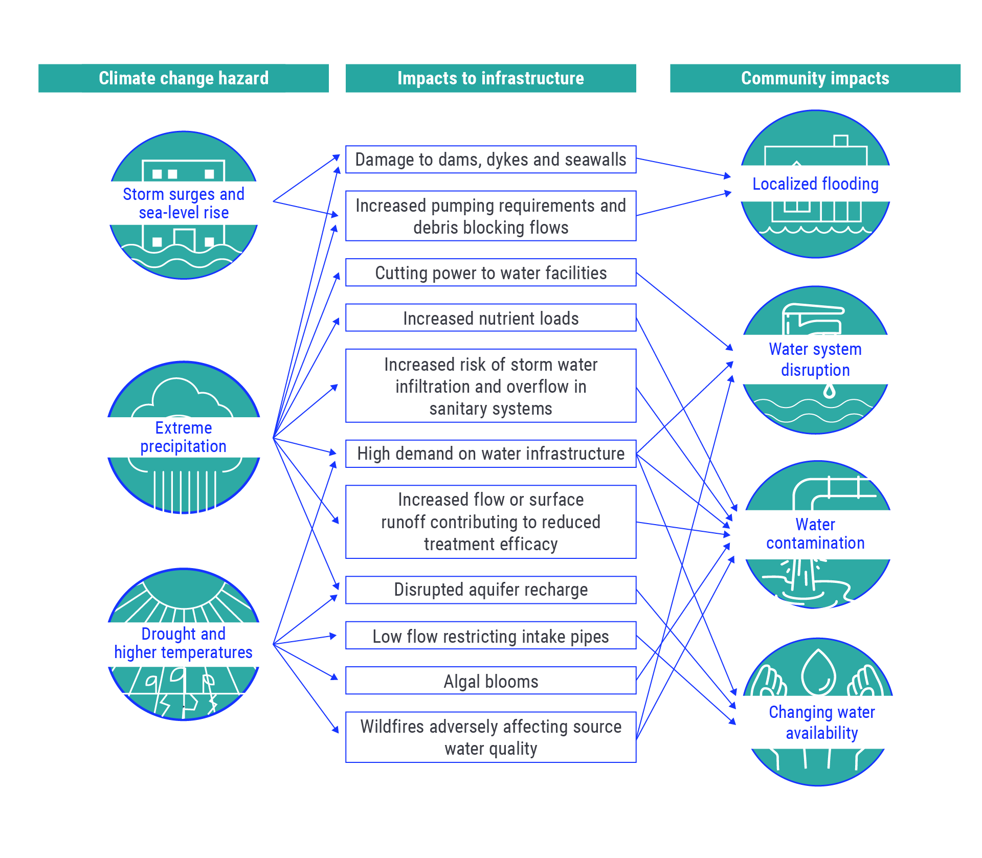 Water is the vehicle that delivers many climate change impacts to society and the environment (IPCC, 2014). Water is a locally variable resource, and society’s vulnerability to climate-related hazards, such as the impacts from flooding and drought, differ from one region to another. Vulnerability to hazards also stems from the ability of societal institutions to adequately prepare for and manage the new risks of climate change.