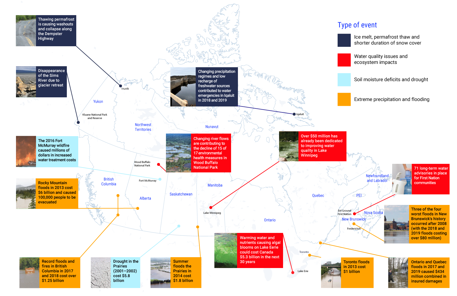 Map of Canada with short descriptions of water resource events across the country. The types of events include ice melt, permafrost thaw and shorter duration of snow cover, water quality issues and ecosystem impacts, soil moisture deficits and drought, and extreme precipitation and flooding.