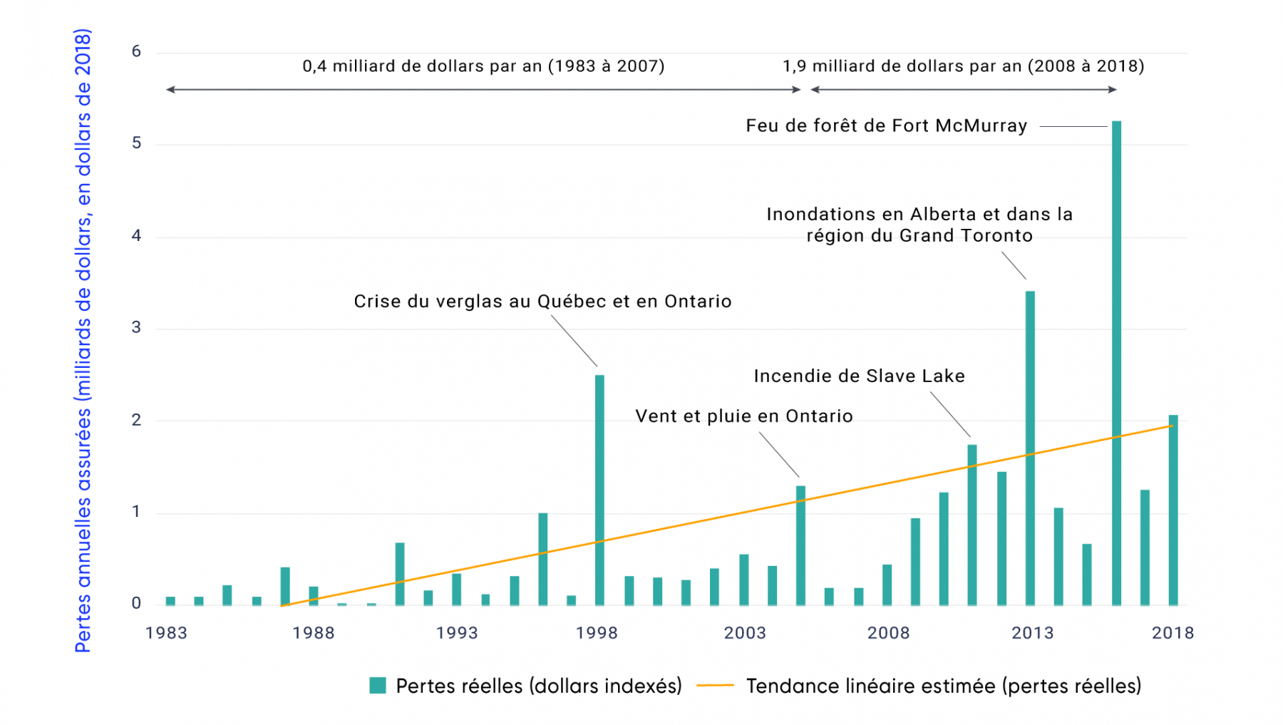 La figure montre les pertes annuelles assurées plus les frais de règlement (en dollars de 2018) à la suite de phénomènes météorologiques extrêmes au Canada pour la période de 1983 à 2018. La hauteur des barres indique le total des pertes et des dépenses liées à tous les phénomènes météorologiques extrêmes pour chaque année. La ligne bleue continue montre la tendance à la hausse estimée des pertes assurées plus les frais de règlement.