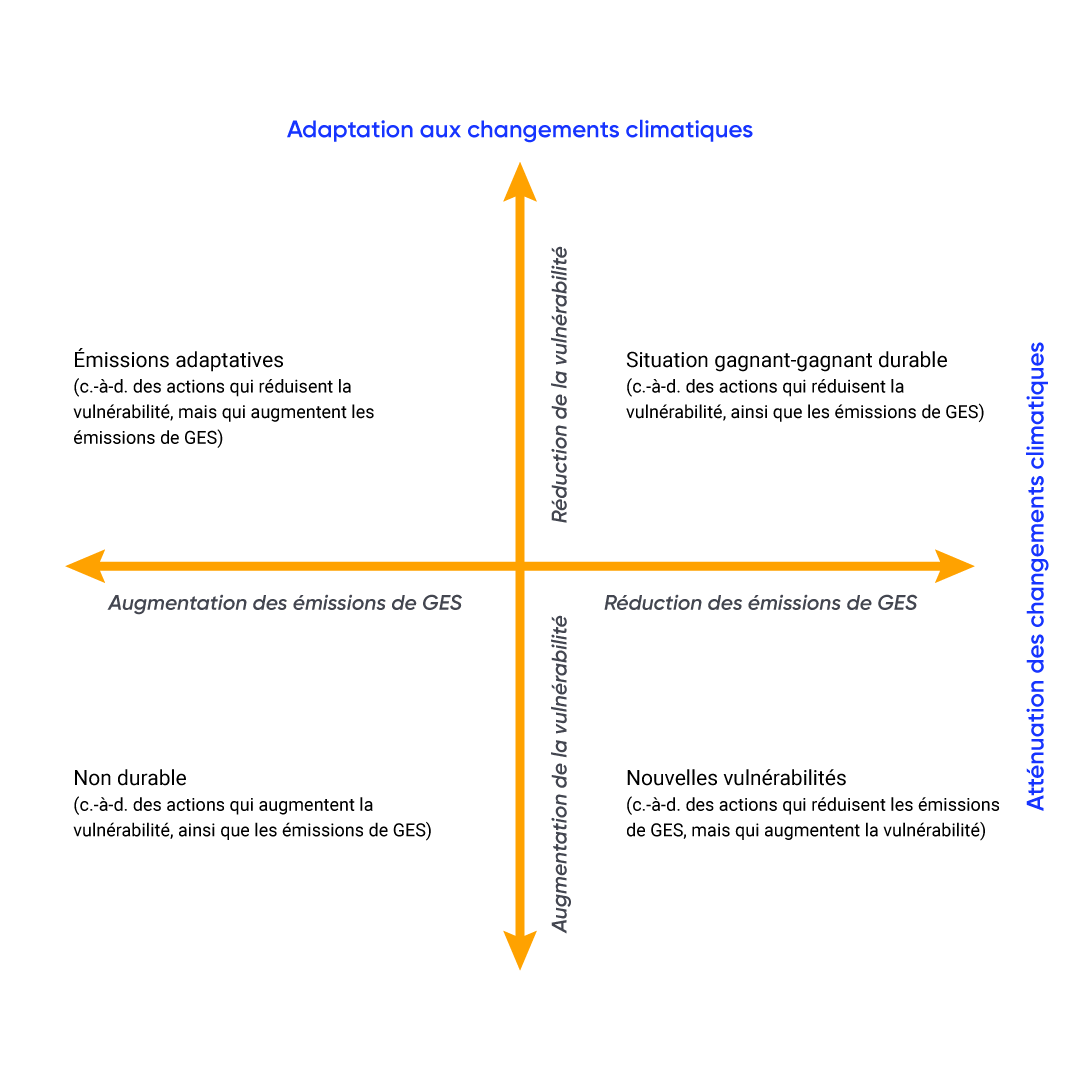 Ce rapport est axé sur l’adaptation aux changements climatiques, c’est-à-dire sur les mesures qui réduisent les impacts négatifs des changements climatiques ou qui permettent de tirer parti de nouvelles occasions. L’adaptation renforce la résilience et réduit les risques liés aux impacts actuels et futurs des changements climatiques. Elle implique l’ajustement des plans, des politiques et des mesures, et elle peut être réactive (c.-à-d. se produire en réponse aux impacts des changements climatiques) ou proactive (c.-à-d. se produire avant que les impacts des changements climatiques ne soient observés). En tant que concept, l’adaptation est simple; dans la pratique, cependant, elle peut aller de la simplicité à une incroyable complexité. Nos connaissances quant à la manière dont les changements climatiques affectent les groupes et les segments vulnérables de la population continuent d’évoluer, mettant en évidence les importantes dimensions socio-économiques et d’équité que revêtent les décisions en matière d’adaptation. L’adaptation offre également la possibilité de générer d’importants avantages connexes, de sorte que les investissements destinés à lutter contre les effets des changements climatiques dans un secteur ou un domaine particulier peuvent se traduire par des avantages pour d’autres secteurs. En revanche, des conséquences inattendues peuvent survenir si la planification et les décisions ne tiennent pas suffisamment compte du système et du contexte général dans lesquels les décisions sont prises.
