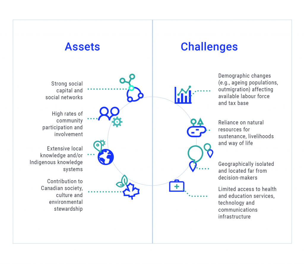 Summary of key assets and challenges for rural and remote communities and areas related to climate change adaptation.