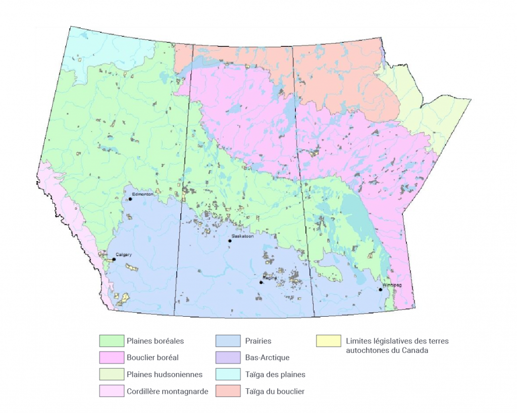 Carte des écozones des provinces des Prairies, montrant également les limites législatives des terres autochtones du Canada, ainsi que les villes, rivières et lacs principaux.